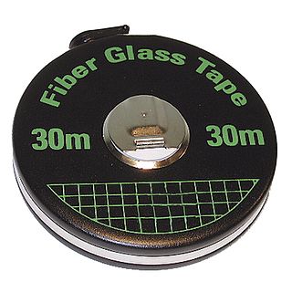 in metal case, with woven rayon tape, strengthened against streching by 8 bronze wires woven into tape, scale graduations both sides: metres and centimetres