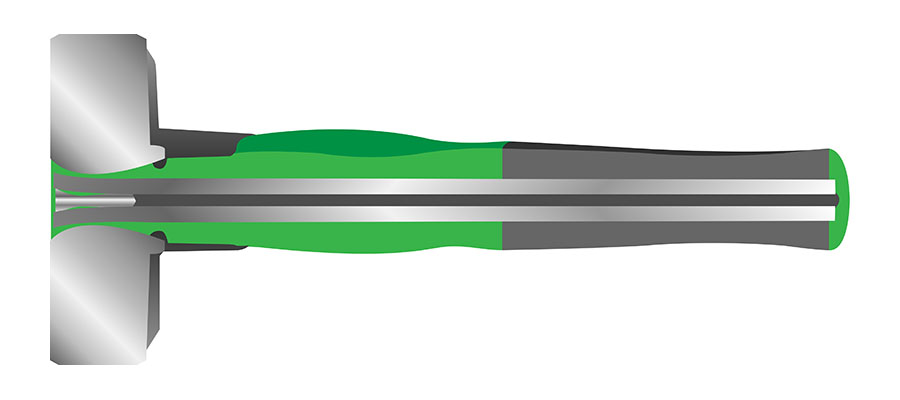 The hammer head with the forged safety collar according to DIN 6475 and rubber protection sheath is secured mechanically in the handle with a heavy steel wedge. The high-safety handle comprises 3 components that are permanently connected to one another! The inner core is made of an aluminium alloy. A polyamide plastic (A2800) that is ultra-resistant to oils and solvents and also the non-slip rubber handle are moulded around this.